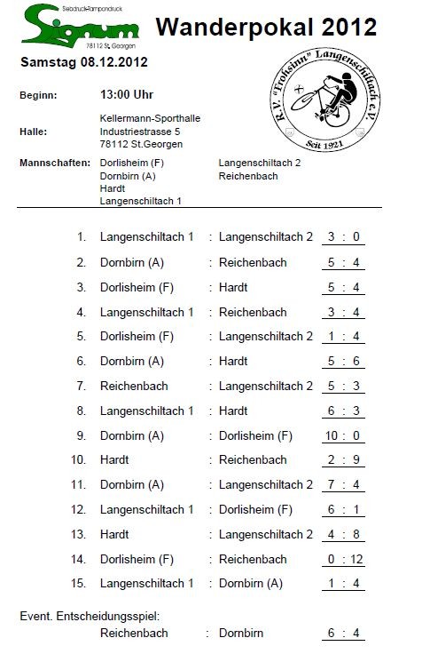 Mit den Rängen 3 und 4 konnten die beiden RVL Teams an diesem Tag nicht in die Entscheidung eingreifen, um die im Finale heftig zwischen den beiden an diesem Tag überlegenen Teams aus Reichenbach/Fils und Dornbirn/A gekämpft wurde. Nachdem beide Teams im Laufe des Turniers jeweils eine Niederlage einstecken mußten hatte dann am Ende das Team aus Reichenbach knapp mit 5:4 Toren die Nase vorn. Aus den Händen von Turniersponsor Ulrich Szembek durften sie so den SIGNUM Wanderpokal entgegen nehmen.
